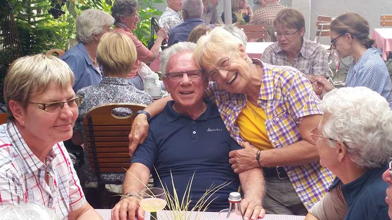 In fröhlicher Runde, im Innenhof der Straußenwirtschaft, bedankte sich unser Ehrenvorsitzender, Herr Dr. Wolfgang Aeckerlein, im Namen aller Wanderer bei unseren Wanderführern mit, wie könnte es anders sein, einer Flasche Ahr-Rotwein, für die herrlich geführte, ca. 14 km lange Tour. Die Wanderung klang hier, – es war die 27. Einkehr bei „Erwin“ – mit Akkordeon-Musik untermalt, sehr harmonisch aus.